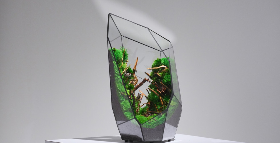 The work of wood and Preserved Moss are transplanted onto the undulating slope within the "Time Crystal" geometrical glass structure, which embodies how little nature can thrive in simplicity, binding us all to something so vast: time.